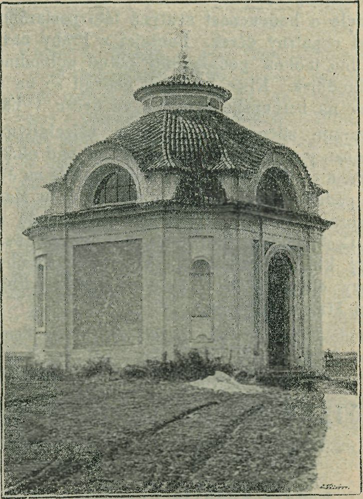 cena a zbožná panovnice věnovala potom jistinu 300 zl. na udržování této svatyňky i na ten účel, aby v ní sloužena byla třikráte do roka nadační mše sv. a sice na den Nalezení sv. Kříže (3. května), ve výroční den jejího1 posvěcení (25. srpna) a v pátek Povýšení sv. Kříže (14. září). Bohužel konaly se tyto služby Boží dle vůle vznešené zakladatelky ve svatyňce léto pouze až do roku 1786, kdy kaple tato byla odsvěcena a zohyzděna. Všecky věci její, oltář, okennice i dvéře, byly uloupeny a pustnoucí budova ta stala se potom skrýší cikánů a jiných tuláků. V zuboženém stavu tomto shledal kapli r. 1891 známý nadšený ctitel starožitností Monsignore Jaehnig, jenž se jí ujal z vděčnosti, že bylo mu