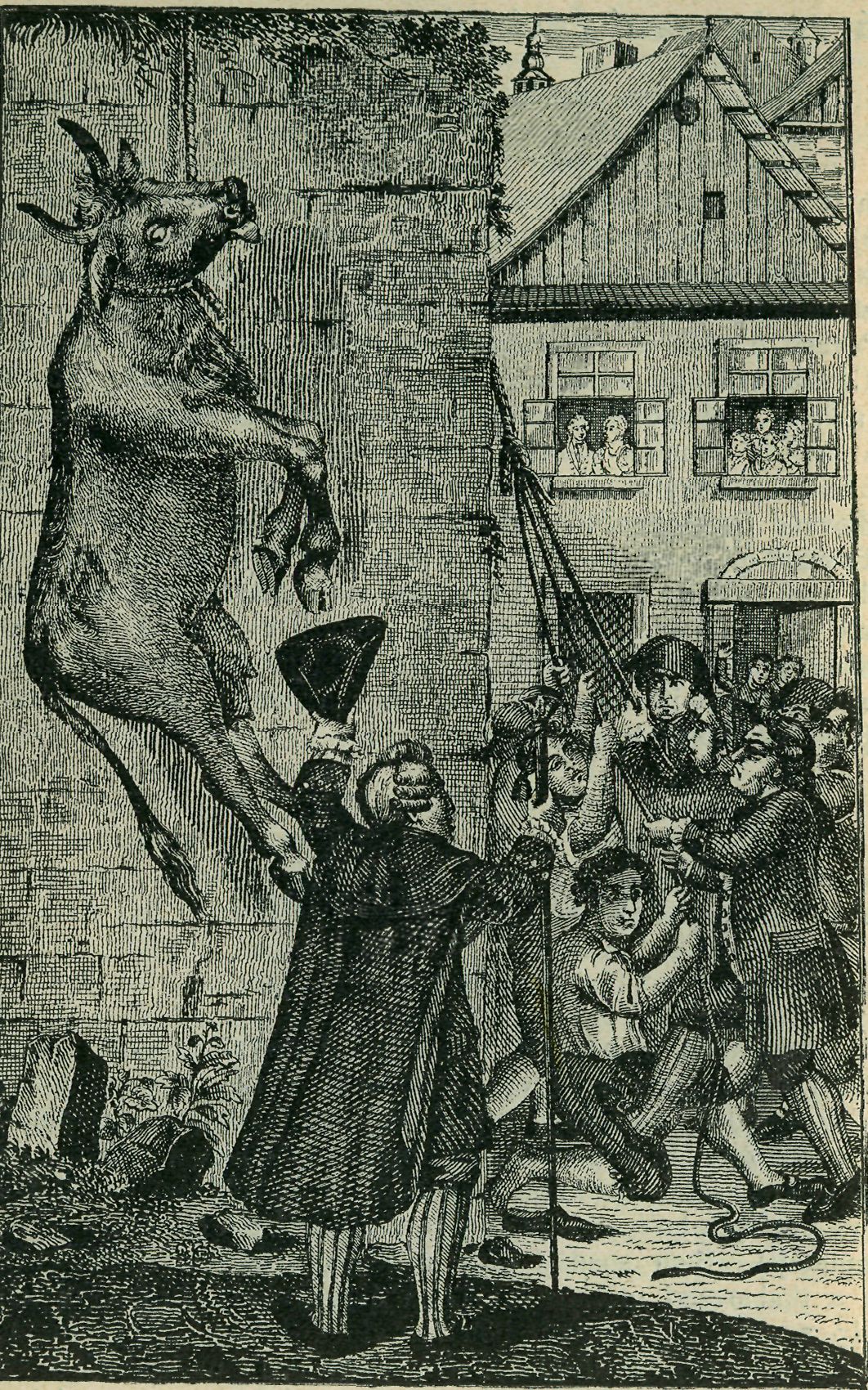 Kocourkovští chtěli s pásti trávu na věži. Staré vyobrazení z r. 1837.