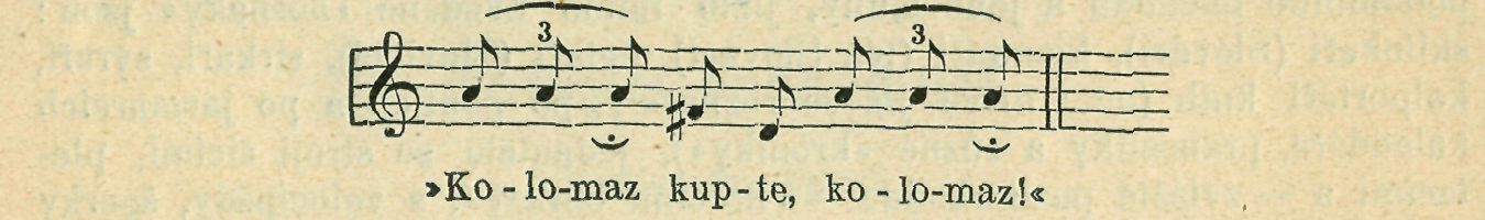 Hospodář opět jest pečliv, aby nepropásl kolomazníka.*) Do většího hospodářství přijíždí kolomazník ob čas na jisto, ví již, kdy asi jim dojde kolomaz. Bez ptaní bére již větší konývku a hospodář jen připomene, aby ji dobře vyškrabal, až vylije obsah do jeho kolomaznice. Mátě každé »řemeslo« své uskoky a chytrosti, to hospodář ví. Staroch kolomazník skuhrá, že musí pantáta krejcárek přidati, že je teď o louč nouze. Skončiv trh, odjíždí dále a spouští pro*všeobecnost své obvyklé hlášení: