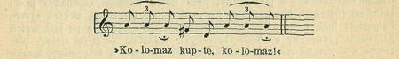 Děti vybíhají před stavení a některý nezveda povystrčiv ze vrat hlavu, opakuje po starci: »Kolomaz!« Avšak staroch je tomu zvyklý, nic ho to nepohoršuje a jede svou cestou dále a zastaví jen, uvidí-li někoho přes cestu k sobě přicházeti.