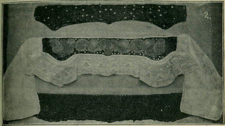 Jako materiálem, tak také vzorem podobají se zachované vínky čepcům. Na zlatém vínku vine se středem rozmarinka, k níž druží se na širších plochách (nad čelem a na uličkách) kvítka; na vínku bílém (obr. 1.) připojují se k rozmarince rovněž kvítka větší i menší. Vínky šité střídavě