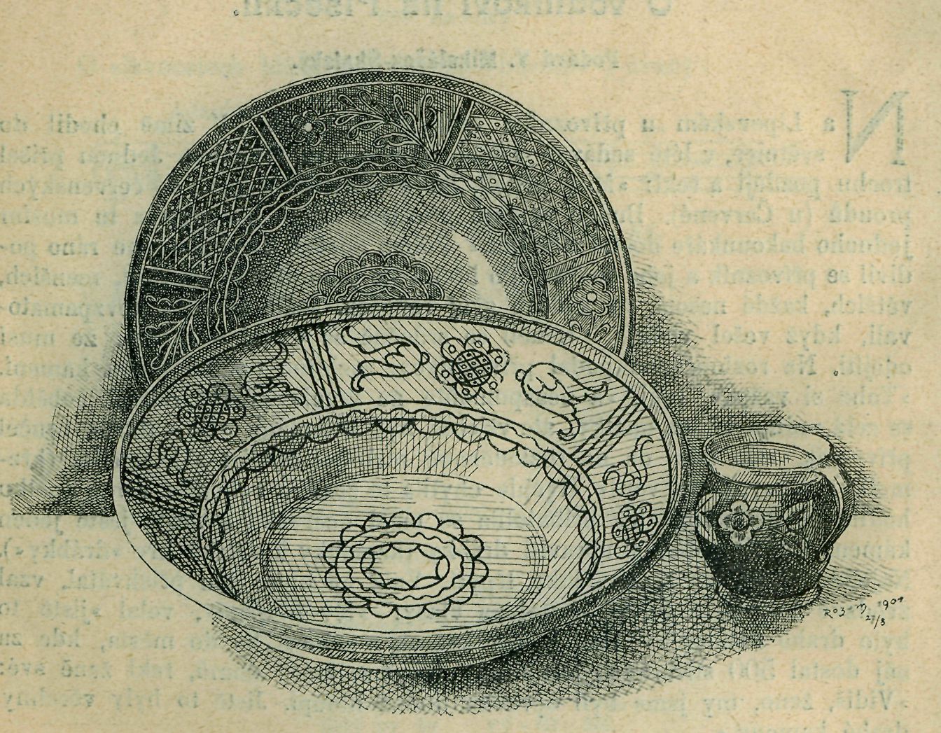 Č. 2 Mísy a hrneček ze Sobéalavě. Kreslil prof. K. Rozum.