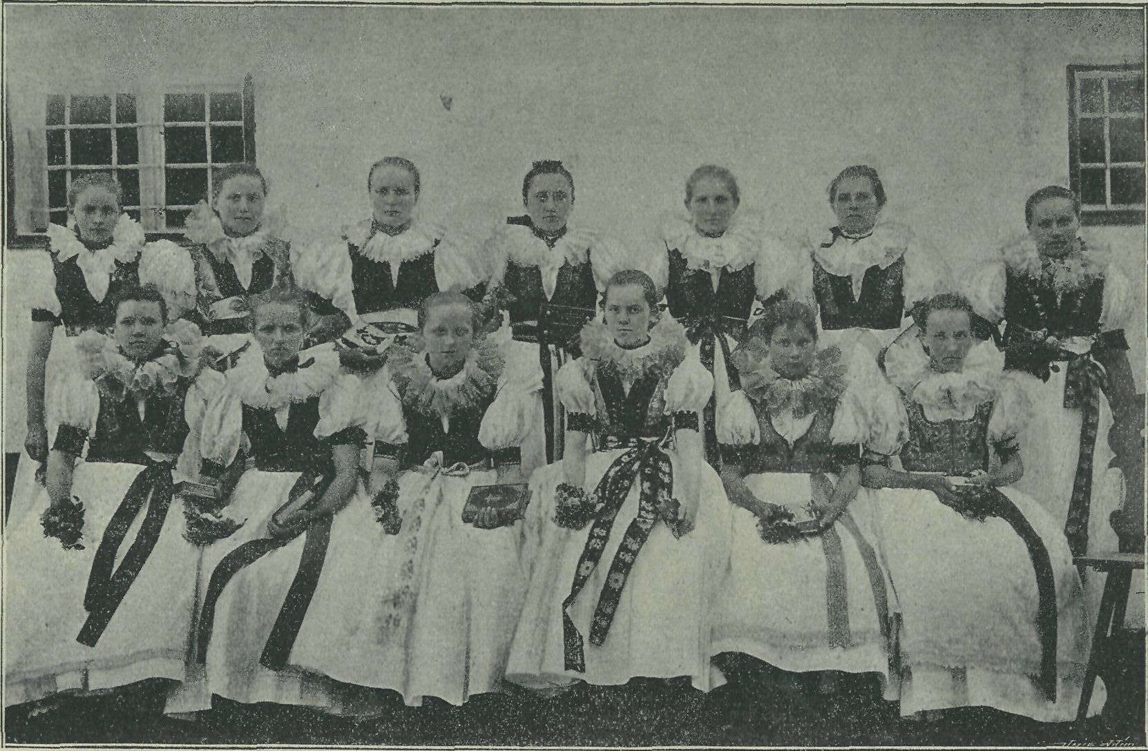 Děvčata z Oseku u Lipnika (ze Záhoří moravského). (J. Vyhlídal, Z hanáckých dědin.)