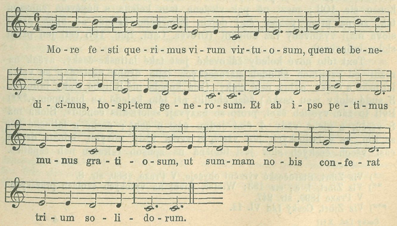 Pro karakteristiku lidového zpěvu tehdejšího podává naše melodie mnoho zajímavého, zejména jak neustálen jest takový lidový nápěv, jak mnoho v něm ponecháno bylo na vůli zpěvákovi a jak mnoho variantů tím vznikalo. Nápěv totiž nesouhlasí počtem not s počtem slabik ani podložené sloky první, tím méně s dalšími slokami ; zpěvák musil si nápěv ke každé sloce metricky upravit, a sice asi takto : 1. dlouhá nota (Jonga), zakončující každý druhý verš, rozdrobila se na 2 noty ; 2. před motiv vložila se nová nota (zdvih); 3. při českém textu, jenž má pravidelně o slabiku více než latinský, rozdrobila se asi první nota (semibrevis) na 2 minimy. Tím nápěv musil být velmi rozmanitý a živý; podle toho musíme se však chrániti před dedukcemi o věcech s tím souvislých. Rhythmus jest tu nepochybný, nikde nevybočuje z § neb | taktu. Dekla-mace však záležela na dovednosti zpěvákově, zvláště česká, jak ukazují dole uvedené příklady; celkem však možno říci, že deklamace je velmi slušná aspoň v principu, ať už některé verše žák nedovedný zkomolil jakkoli. Celý nápěv pak při vší jednoduchosti jest svěží a ušlechtilý, srovnáme-li jej na př. s triviálním popěvkem v »Mastickáři« (viz přílohu notovou k mým »Dějinám české hudby«).