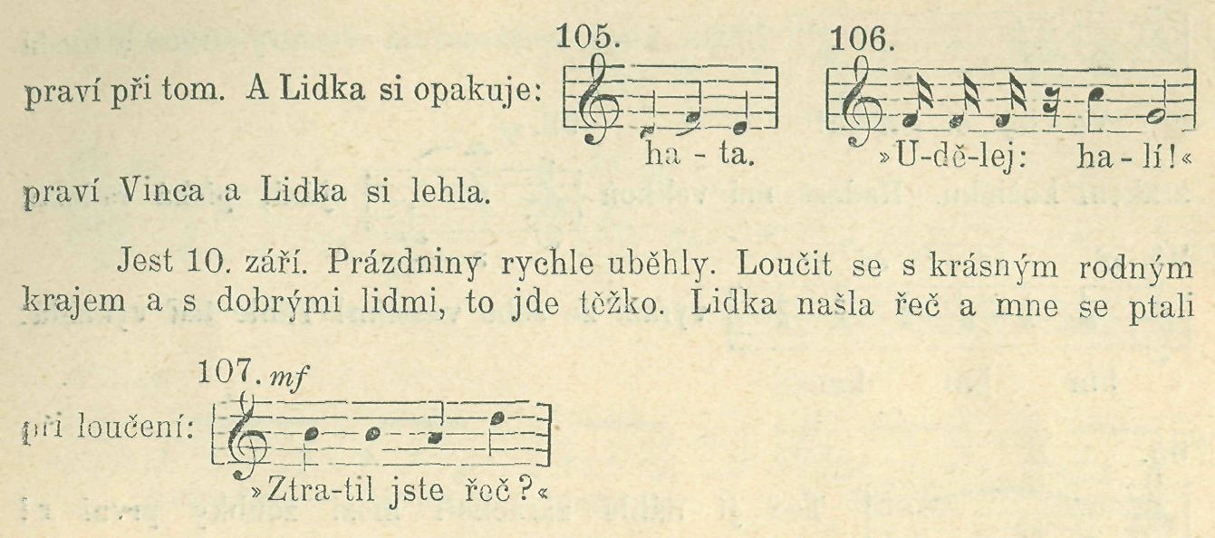 3. Totéž děvče při opakování o koruně, když byla ukázaná koruna (peníz) pojmenována, odpovědělo na otázku: Odkud je koruna? takto: »Koruna je z Brna.« (Nedávala pozor a pak snad rým ji svedl. Co j-e Brno, nevěděla, ale měla slovo to z písně ku hře >na bránu« (Malát, Zpěvník I.), při které bylo vyloženo.)