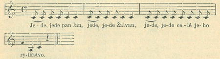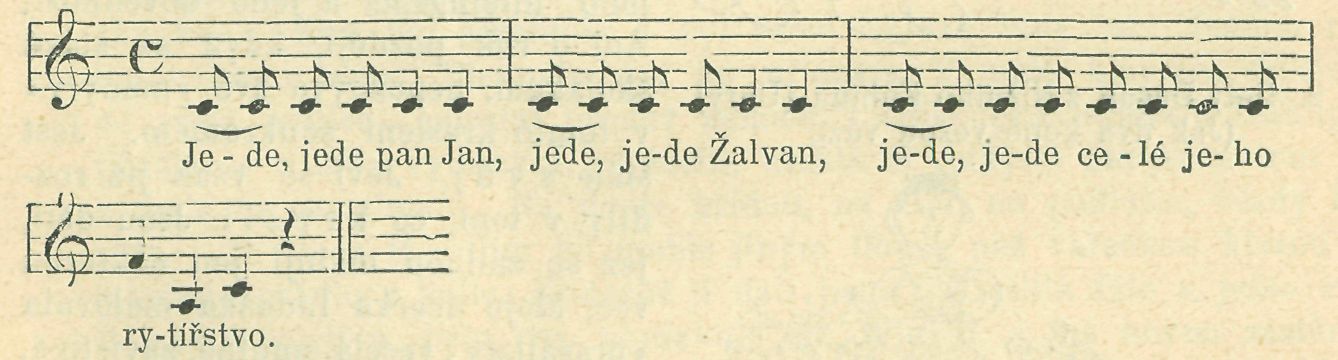 Když se potkají, obyčejně když zpívají »Žalvan«, pokloní se a postupují zpět. Pak střídavě zpívají: »Co tu chce pan Jan, co tu chce Žalvan, co tu chce celé jeho rytířstvo?« »Chce tu pannu krásnou, nad nebesa jasnou jako růže v zahradě.« »Tu máte ji, pan Jan, tu máte ji, Žalvan, tu máte ji eelé jeho rytířstvo.« (Jedna přejde z řady na druhou stranu.) »Děkuje vám pan Jan, děkuje vám Žalvan, děkuje vám celé jeho rytířstvo. < V hře se pokračuje, až zbude z celé řady jen jedna. Ta jest pak »pan Jan« a hra se opakuje.