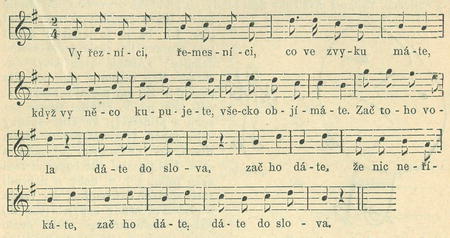 Když zazpívají slovo »objímáte«, zastaví se a při dalším zpěvu na každou čtvrt třepají rukama jednou proti sobě, po druhé každé samo.