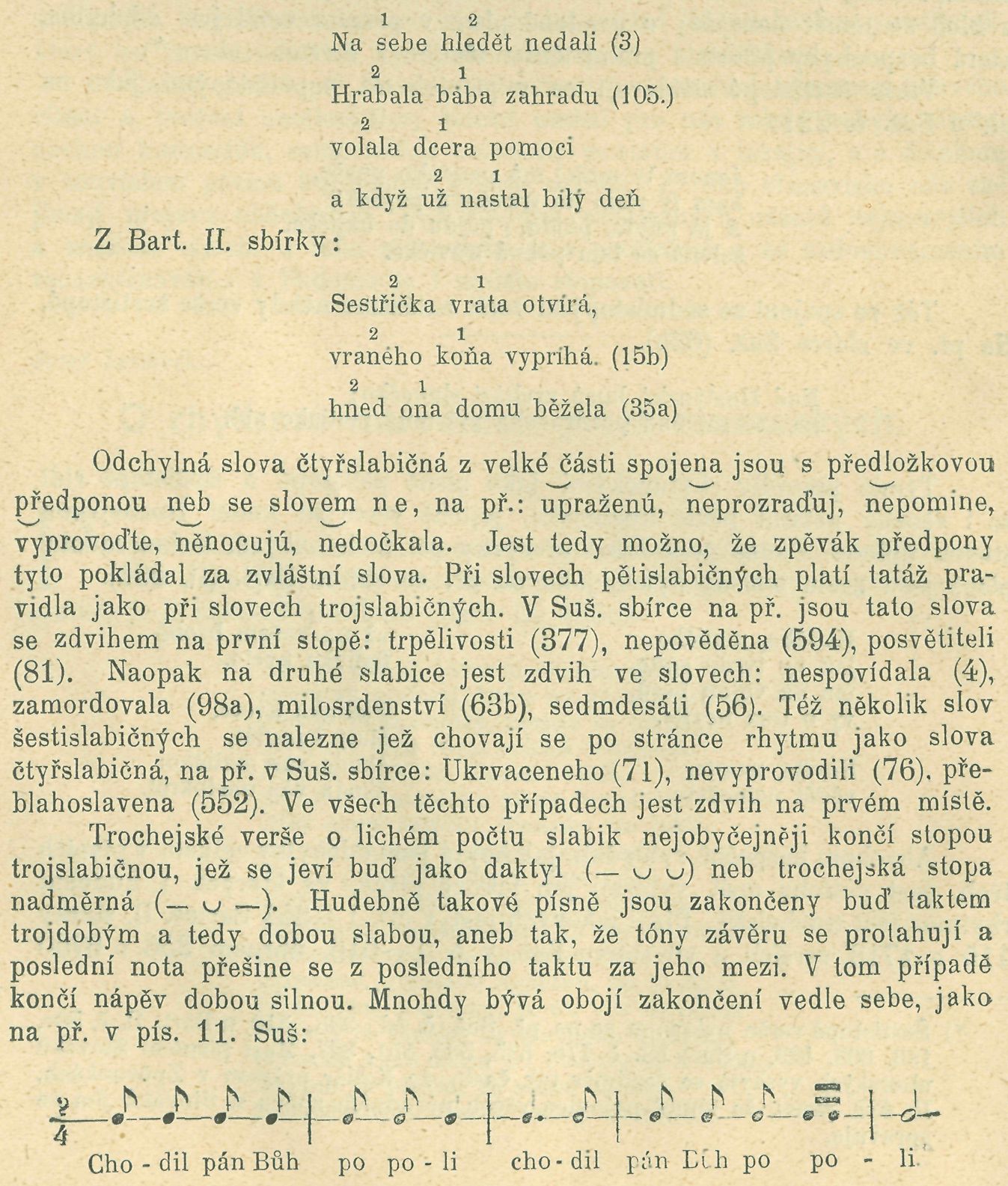 Připadá tedy na 100 veršů asi 1 odchylka při slovech dvouslabičných a tolikéž na sto veršů při slovech čtyřslabičných. Slova dvojslabičná odchylují se od pravidel tím, že se v nich přešinuje zdvih na druhou slabiku i v takových případech, když nepředchází před nimi slovo jednoslabičné. Stává se to nejvíce po slovech trojslabičných. Asi třetina těchto odchylek odstraní se pouhým přehozením jednoho neb několika slov v chybném verši, i možno pravděpodobně dovozovati odchylky takové z poklesnutí paměti zpěvákovy. Za příklad uvedeny buďte ze sbírky Suš. tylo verše:
