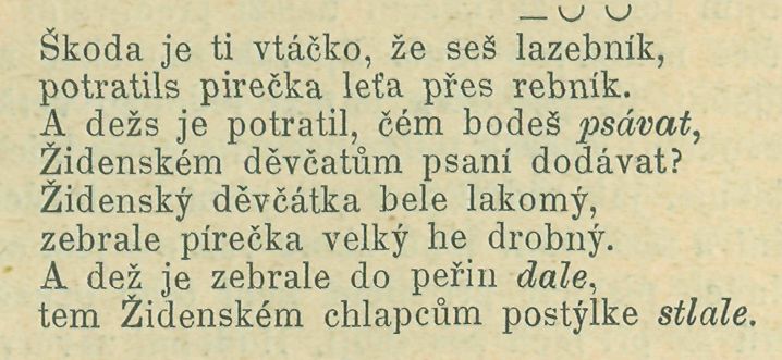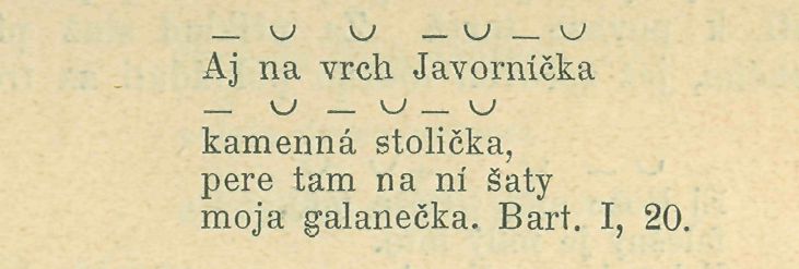Kdybychom pokládali poslední slabiky ve verších těchto za přízvučné, dopustili bychom se ve slovech tiskem označených odchylek od rhythrnu trochejského. Začíná-li trochejský verš trojslabičnou stopou, jest stopa tato vždy daktylská. Na př.