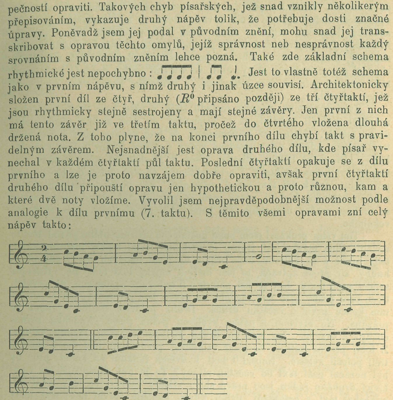 V těchto dvou melodiích vidíme na první pohled melodie náležející hudbě instrumentální. Obě jsou ne v pozdější církevní tónině jonické, nýbrž v pravém tehdy jen Y lidové hudbě možném dur. V druhé melodii máme třikrát úplný rozložený durtrojzvuk (takty 7, 11, 15 a 16), jehož harmonický význam vine se celou melodií ; první melodie není tím již tak nápadná, ač i zde vidíme týž zjev (rozložený trojzvuk v taktech 22 a 23). Druhá melodie proniknuta významem tohoto c-dur trojzvuku tak, že nikam nemoduluje, ani do dominanty, ba vůbec nemá jiného harmonického podkladu než tento trojzvuk. To, tuším, neklamně poukazuje na píšťalový vznik těchto nápěvů, zvláště druhého, a sice na melodii dudáckou. Aspoň pod druhou melodií sama sebon se vybavuje představa prázdné kvinty držené měchem dud, k níž dudák pískal tuto melodii. To možno opříti i o jiné vlastnosti těchto dvou melodií. Objeví-li se v li-
