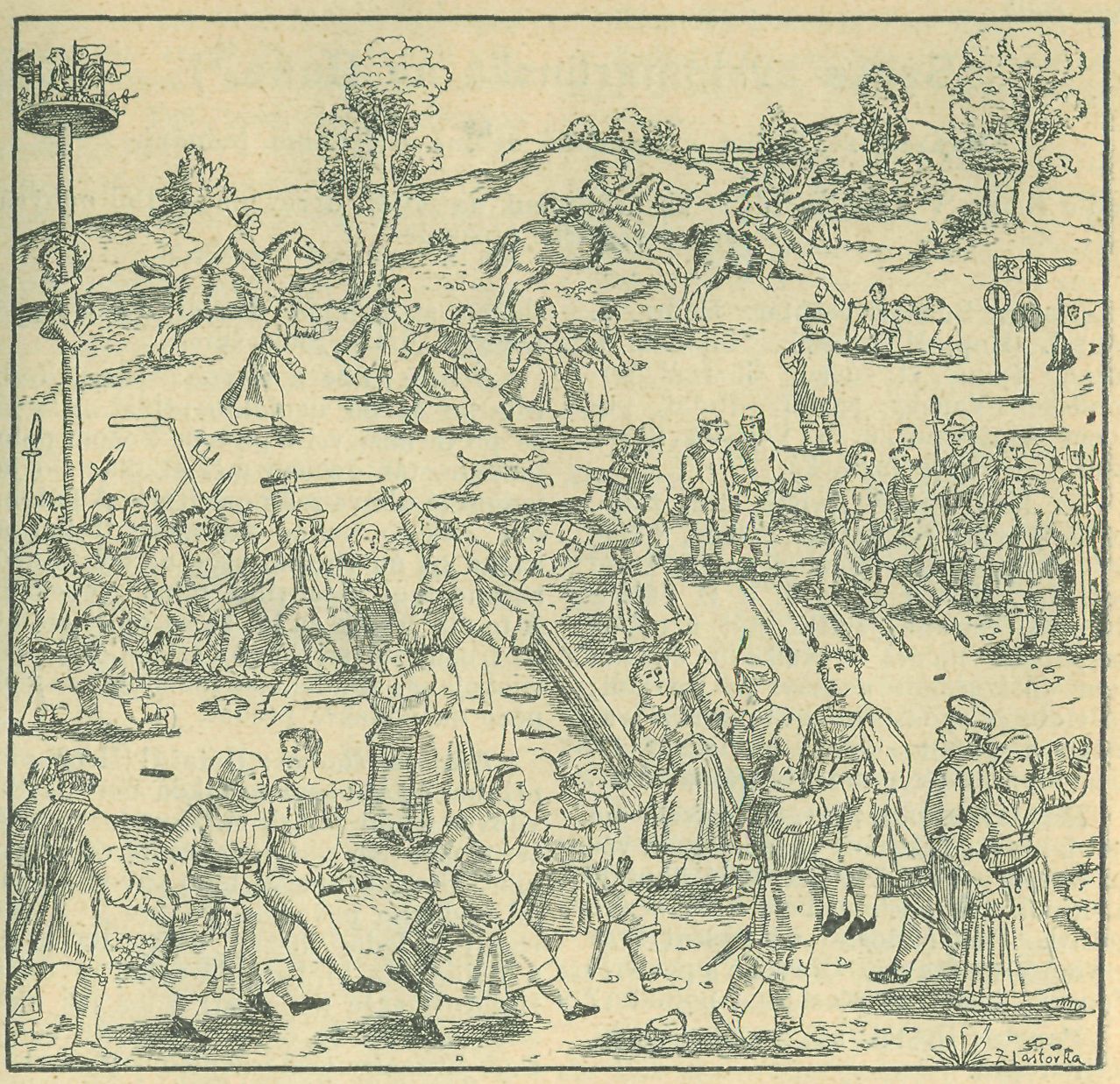 Zábavy lidové v XVI století. Kresba L. Laštovky. @A@Dr. Čeněk Zíbrt: