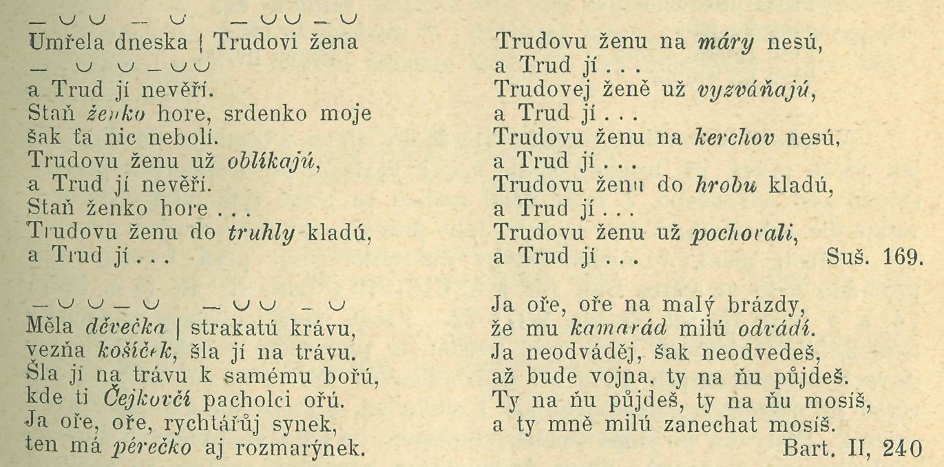 Z daktylských veršů jsou nejobyčejnější ty, v nicbžto se střídají trocheje s daktyly, a to tak, že na prvním místě v nich stojí vždy daktyl. Za vzor uvedeny buďte tyto dvě písně :