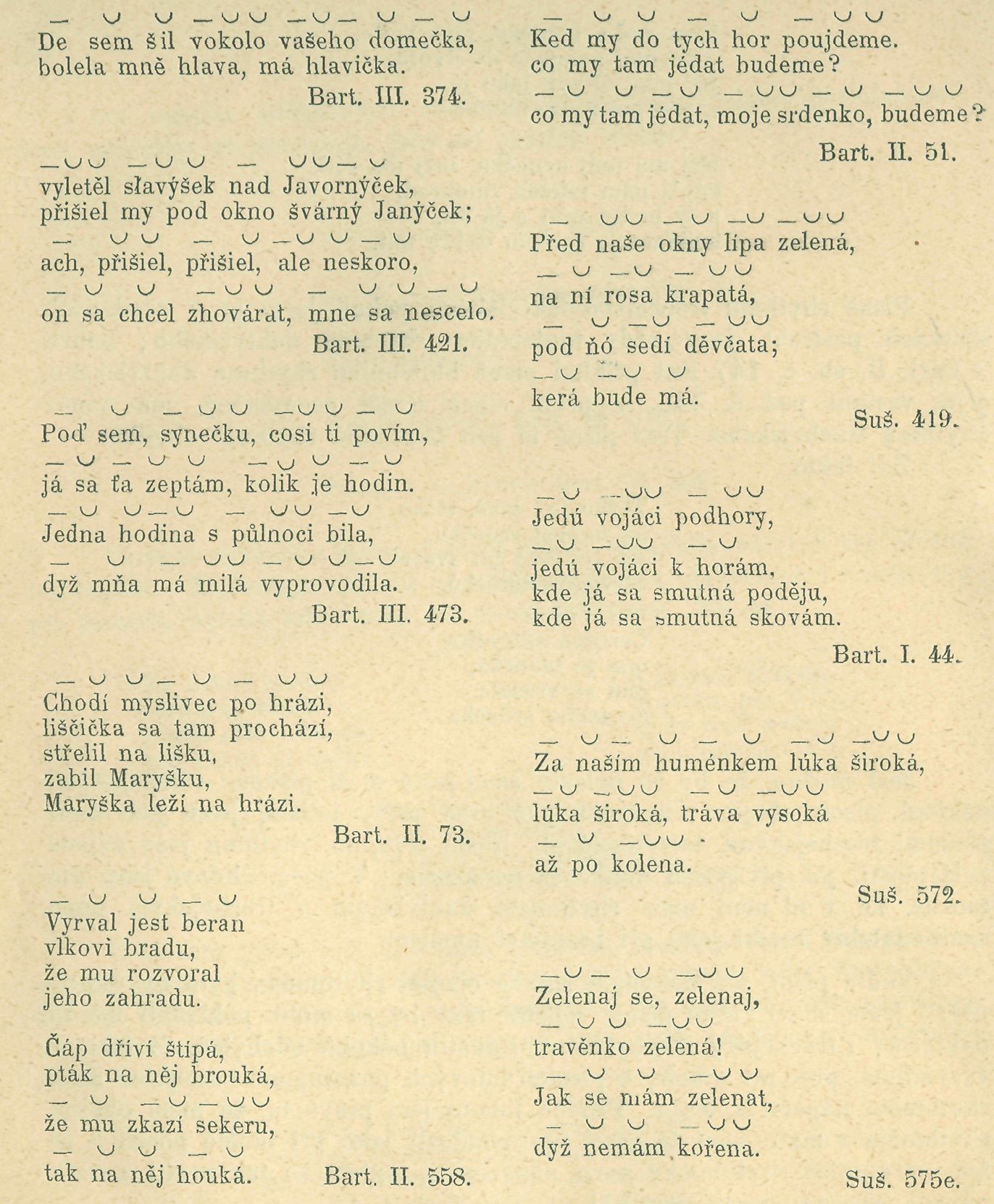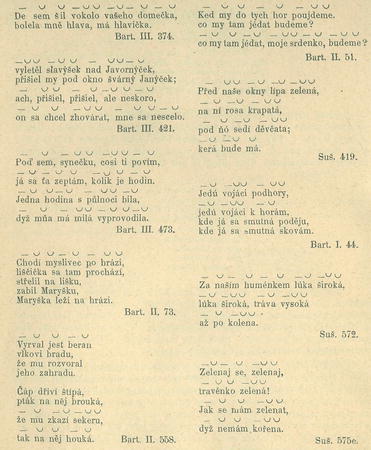 Zde podáme jen některé ukázky jejich, aby rozmanitost rhytbmu jejich vynikla. Z Bart. II. sbírky tyto ukázky: