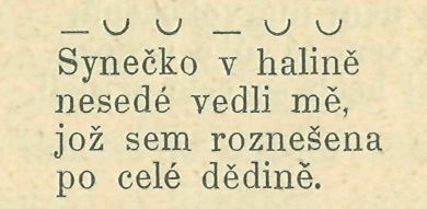 bickému, a dva trochejské. Text sám jest dokonale trochejský. První z uvedených písní má dvojí nápěv s předlaktím, jeden trochejský a jeden daktylský. Též tato píseň textem jest trochejská. Jest patrno, že jen jeden z těchto nápěvů, a to jenom trochejský mohl vzniknouti současně s textem; je-li to však týž, který jest pojat ve sbírku, těžko říci, jelikož nápěvy, dokud kolují v lidu, právě tak podléhají změnám jako text.