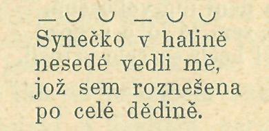 První tři sloky písně této jsou ve shodě s nápěvem daktylský správné; v posledních však dvou slokách jest plno odchylek od rhytmu tohoto, ač trochejský jsou docela přesné. Tylo sloky zní takto: