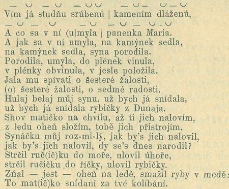 V písni této sudé verše začínají v několika řádcích daktyly, jinde trocheji. Podobně se to má při č. 18. a 103b Suš. sb. Tato druhá píseň zní:
