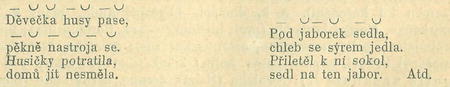 a při druhé z části daktylský. Tuto druhou zde uvádíme s naznačenými opravami, a to opět tak, že závorkami označujeme slabiky, jež dle domnění našeho by se měly vypustiti, a vodorovnými čarami ty, které by se měly přičiniti.