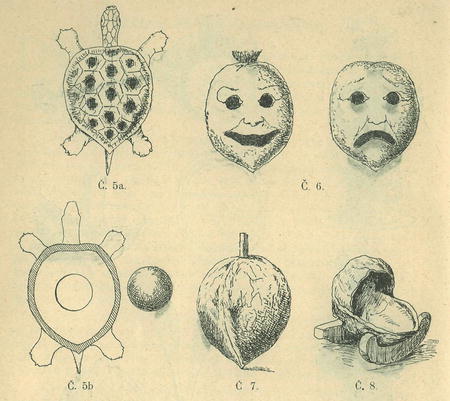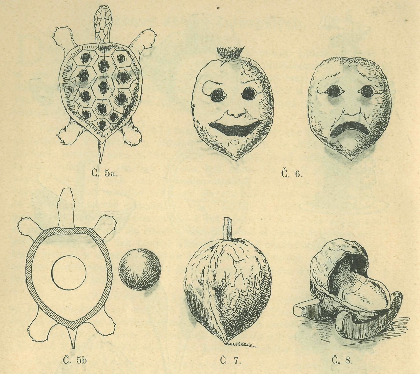 Vlček z ořechu (č. 7.) je hned hotov. Zašpičatělá zápalka totiž vstrčí se do ořechu plného. Vyberte siořech hezky pravidelný, s ostrou špičkou. Setrvačnik točí se na talíři nebo na stole mramorovém.