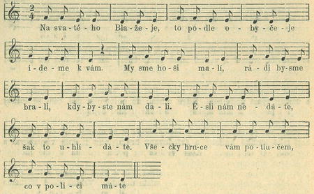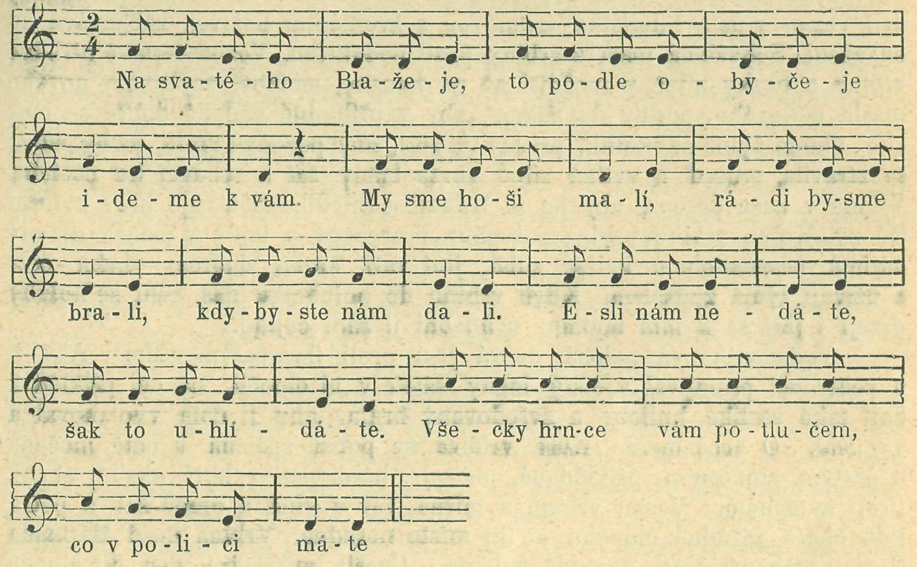 A to se ví, že takové vyhrůžky se každá hospodyně lekla! Rychle donesla kus slaniny, napíchla na rožeň, sotůrek obšfastnila několika vejci, do koše uložila pěknou bábovku. Chlapcům dala každému po krejcaru za to, »že tak pěkně zpívajú«. Ti pěkně poděkovali a táhli vážně, uvědomí své hodnosti, jelikož to byli chlapci obíraní, k >pudmístrom<. Vše opakovali. Tak obešli celou dědinu. Několikrát ovšem zašli do školy a složili drahocenný náklad, jelikož lidé štědře dávali. Co kdo měl: slaninu, maso, máslo, mouku, chléb, vejce a j.