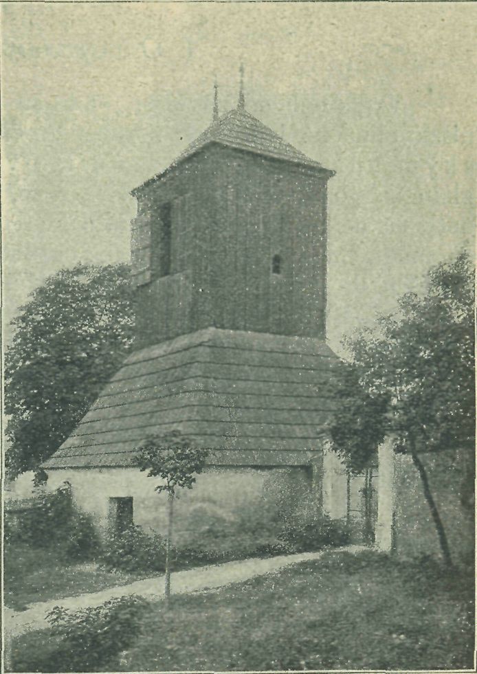 Gotická osmiboká zvonice v Libušině dřevěná (viz půdorys), šindelem krytá, uvnitř 8-70 m, dlouhá a 7'70 m. Široká, s kamennou podezdívkou 330 m. vysokou a 095 m. silnou, stavěnou ze zvonivé opuky, lomu pazourku podobné, má dva zvony.