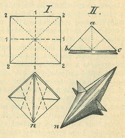 Překládajíce papír, robí děti hračky (viz vyobrazení): loďku, husu, koníčka, ptáka, stolek, parník s kulatými a špičatými komíny. Děvčátka dělají si košili. Při hračce s přihrádkami říkává se: Nebe, peklo, ráj, kam tě duše dám, do nebíčka, do peklíčka šupy, šupy tam. Při tom dle rytmu říkadla dávají se prsty do přihrádek.