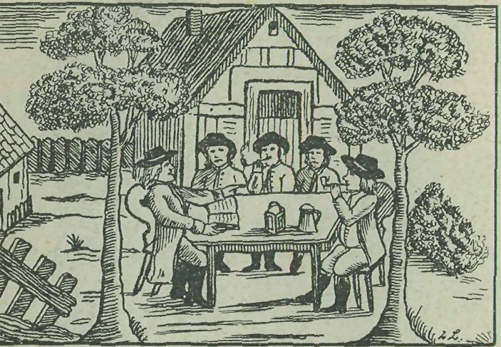 * Mužské kroje selské 0 konce věku XVIII. Rytinka neumělá z titulního listu jar-marečních písní znázorňuje kroj mužský na venkově českém na sklonku věku XVIII. Sešli se sedláci na besedu. Pokuřují, poslouchají výklad rychtáře (?), čtoucího v knize. Židle, na nichž se posadili, v pozadí chalupa, plot za chalupou, všecko jest znázorněno pečlivě a shoduje ses jinými obrázky souvěkými. C. Zíbrt.