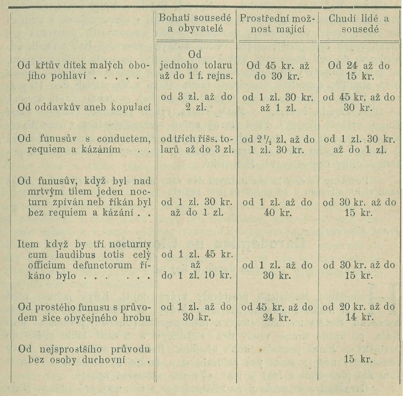 Od nejchudšího a žádné možnosti nemajícího souseda, obyvatele neb některého žebráka v špitále zůstávajícího notandum nic žádáno býti nemá, nýbrž z milosrdenství darmo vykonali má. (Dle písma ze 17. stol. Arch. arcib. Pražs. Parochialia L. Orig.)