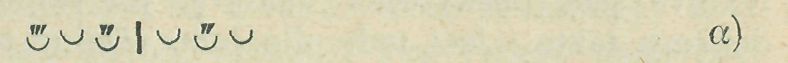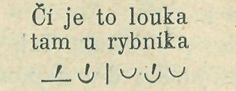 Místo tří dvojslabičných slov (skupin) vyskytují se také případy slova člyřslabičného s dvojslabičným aneb opačně: (vosy, sršáni) vyletěli na mne. Na těch Luženických (lukách). Přesně vzato musíme zase říci : >čtyřslabičné skupiny*, tedy na př. ze slova trojslabičného s jednoslabičným a naopak vytvořené : Rybička je malej (vokounek). Ta Luženská louka. V těchto př/padech jest jeden z přízvuků, připadaje dovnitř slova, valně seslaben. Číselné schéma jest: