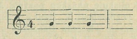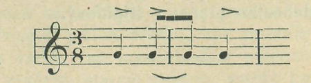 Pravím výslovně: rythmus; neboť nejde nám o melodii, ponejvíce v osminách dle slabik článkovanou. Takto byly by tedy na př. notovány bicí nástroje (na př. buben, triangl, též podupy a tleskání rukama) zpěv doprovázející. Každému hudebníku jest patrno, že změnily se tyto dva takty tří-osminové v jeden tříčtvrtní, tedy