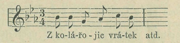 Tento text, který se též zpívá na melodii výše napsanou, jest deklamován zcela správně. Podobně č. 426: »Naše máma prála< a č. 531: >Podívej se na mne« (moll), oba docela správně deklamované. Jiných textů na tyto melodie zpívaných ve sbírce Erbenově není. Vyskytuje se vsak v Erbenovi několik písní, abych tak řekl, polovičních, t. j. obsahujících v obou polovinách jen po dvou furiantských dvoutaktích. Takovou jest ě. 157: