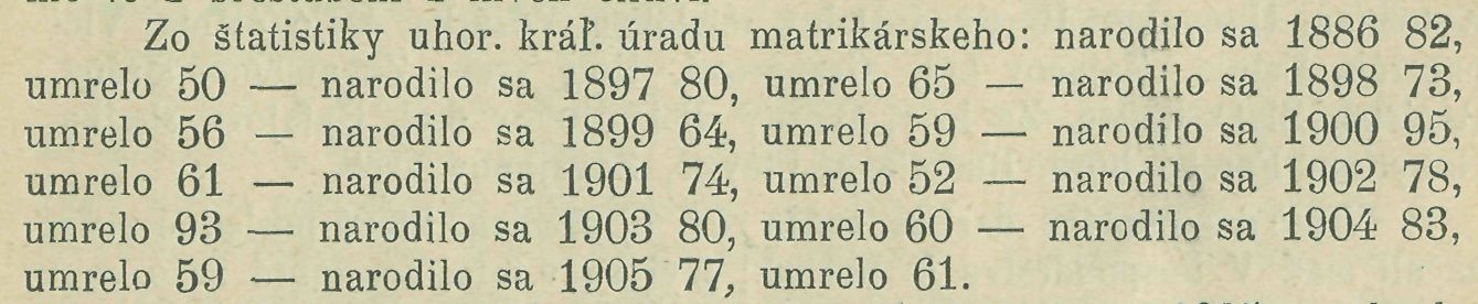 Narodilo sa r. 1904 ženských 49, mužských 34, r. 1905 ženských 42, mužských 35. Umřelo r. 1904 ženských 28, mužských 41, r. 1905 ženských 30, mužských 31. Nemocí, ktoré by pravidelné riadily v obyvatelstvu, nieto.