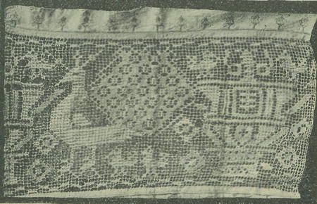 Nejdůležitější a nejrázovitější a po stránce umělecké nejdokonalejší jest ornameňtika, která je vykonána na síti. Prohlédneme-li si tyto ornamenty, lze jo roztříditi na tři druhy: na geometrické, figurální a květinové. Jsou' ťo vesměs ornamenty, které lze udělati na kvadratické, síť-