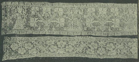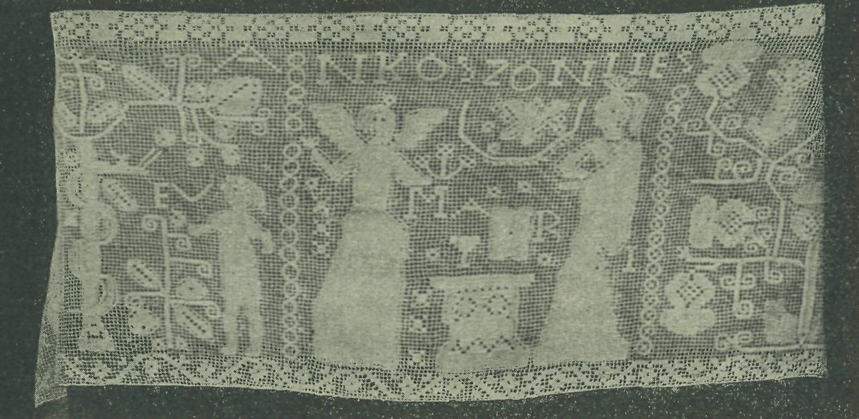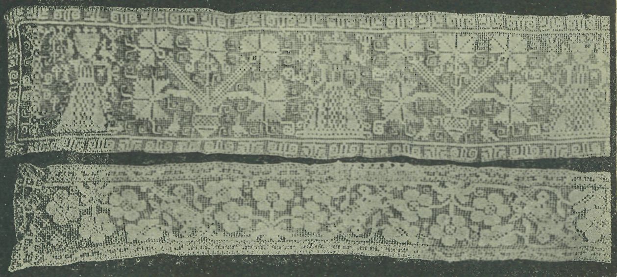 obětování Isakovo. Obzvláště tato poslední práce ukazuje svým slohem na znamenité stáří. Ostatní práce byly pro domácnost, a to bud' se jich užívalo jako ozdoby hlavy (čepce), buď jako vložek do úvodnic svatebního roucha, bud do prostěradel a koutnic. Na těchto spatřujeme pře-rozmanité květinové a geometrické ornamenty, pěkně harmonicky a slo-