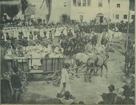 Vůz s nevěstou a družičkami na národopisné slavnosti v Dřevohosticích 1893.