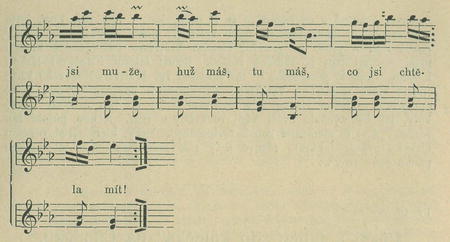 Variace její, hudebně interessantní, dopodrobna sleduje i melodickými útvary střídání obou rythmů. Obyčejný rythmus jest tu v^charakteristické formě , _