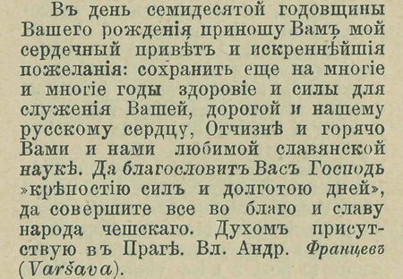 Serdečno pozdravijajem vysokočtima-go jubiljara. Žnamenitomu českomu isto-riku, gorjačemu patriotu, slavjaninusláva, mnogaja lea. Prof. Konst. Grot (Petrohrad).