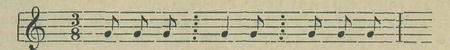 váného. Vyznačení mnou navržené — tečkování, v tomto případě dvou čar taktových — vyhoví tomuto požadavku. Poněvadž pak jest tento tvar třídobého rythmu, jak jsme viděli, jediným, nevzniká tím ani víceznačnost. Ve všech následujících příkladech bude nám tedy označení