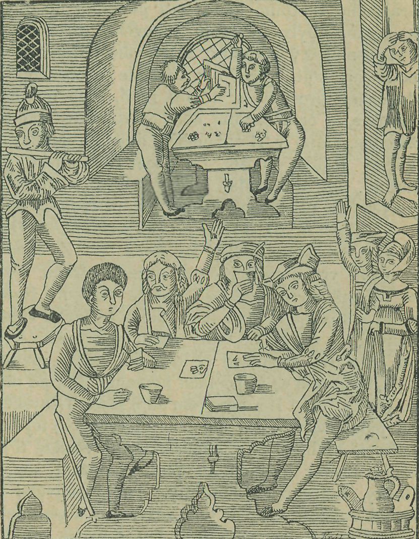 .Č. 2. Hráči v krčmě staročeské před 400 lety. Dřevořezba traktátu Pán rady 1505.