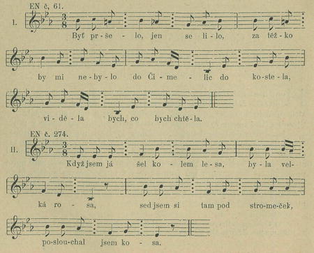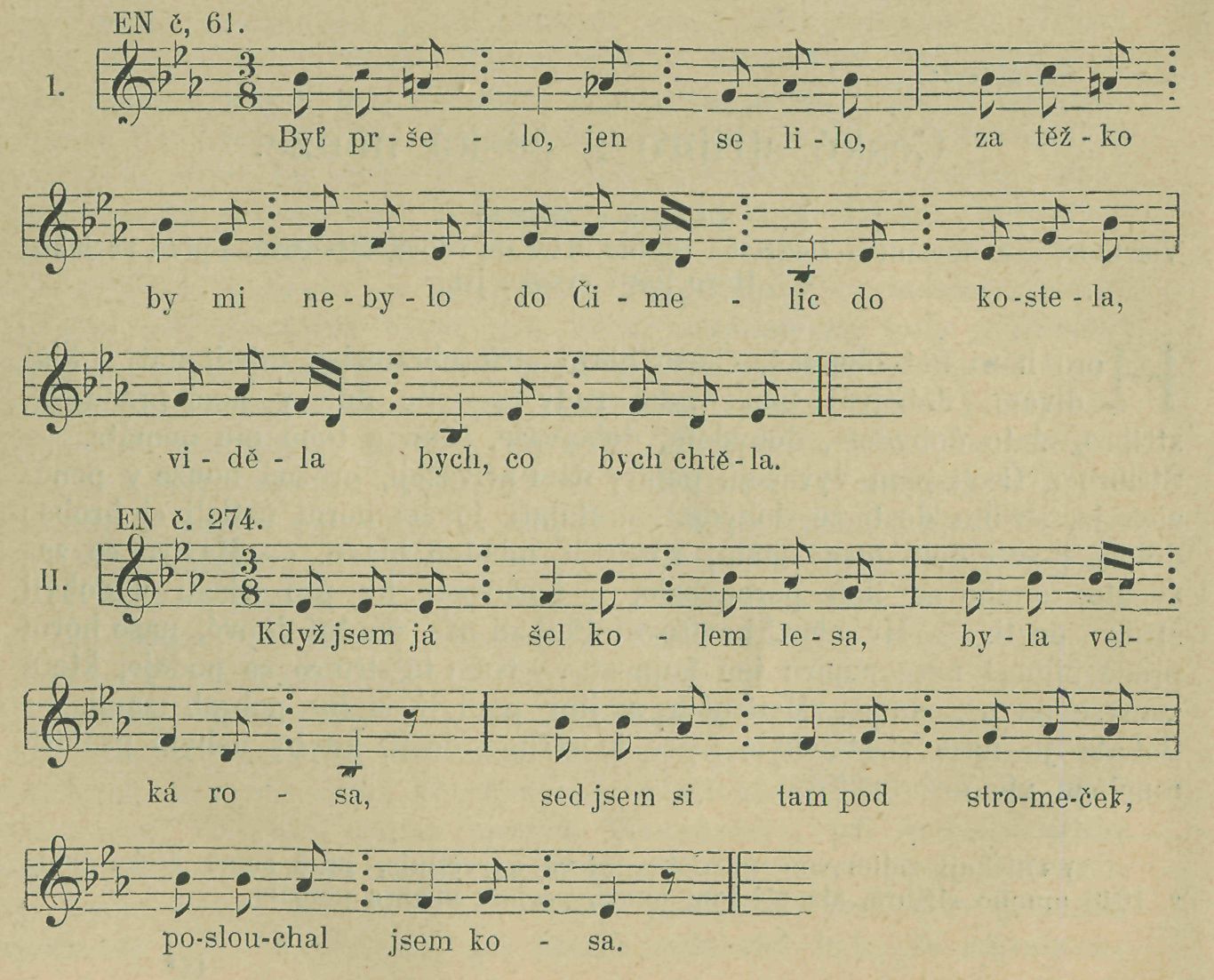 Z toho důvodu chci odbočiti na tomto místě z vlastního rámce úvahy a poukázati na všechny mně známé písně, v nichž rythmus tento se vyskytuje. Z písní sbírky Erbenovy má nepochybný rythmus svítáníčka celkem 11 písní, tedy l'4°/0 všech písní. Jsou to: č. 61, 160, 242, 274, 305, 401, 448, 538, 539, 726 a 747 notové přílohy. Aby bylo možno lépe je srovnati, uvedu je všechny v tříosminovém tempu (tři z nich tak Erben uvádí, ostatní ve tříčtvrtním) a v Esdur.