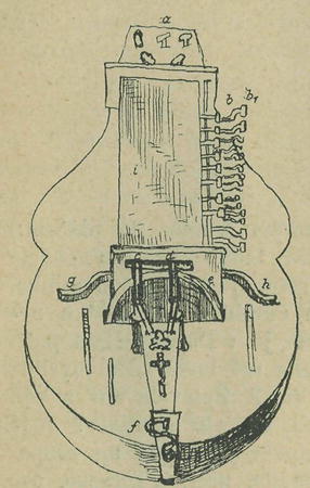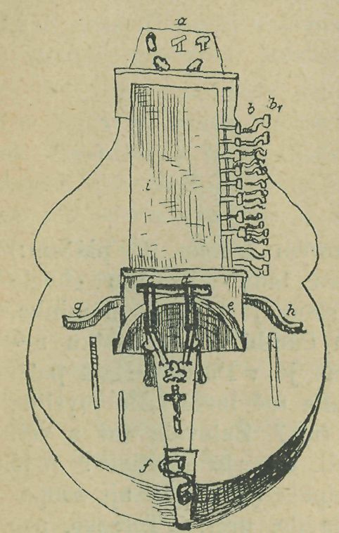 děny. Melodie se hraje na klávesnici, ukrytou pod deskou (i). Klapky (na naší niněře dvě řady b, hx) narážejí na struny, čímž se struny zkracují a různé tóny se vyluzují. Ve zvučení hráč struny uvádí kolečkem (e) pryskyřicí natřeným a klikou (f) otáčeným; a nám značí kolíčky k natahování strun, g, h podpěrky k podepření stojánku, jímž procházejí 2 páry strun (c, d).