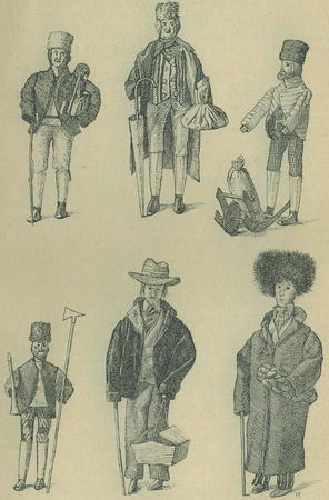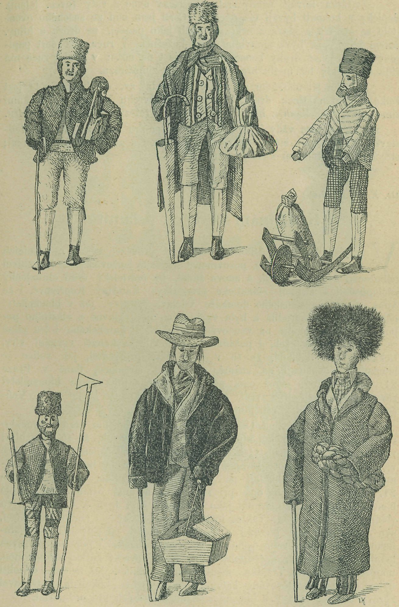 1—6. Panáci, »koledníci«, z trhu Mikulášského a vánočního y Klatovech (nyní v museu). Kreslil prof. F, Vanřk.