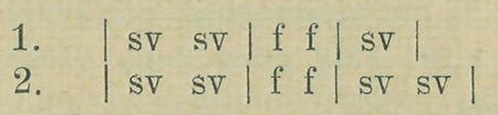 Třetí skupinu tvoří písně, u nichž v prvním díle vládne rythmus svítá-níčka, v druhém furiantský; pak se díl první bud1 částečně neb zcela opakuje. ' Jest to tedy buď náběh aneb skutečná třídílná forma. Schéma dvou písní z Erbena sem patřících jest