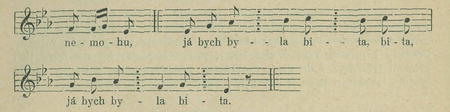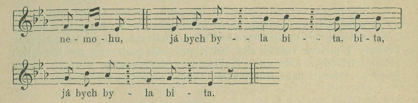 Druhá píseň obsahuje známý motiv svítání. Delší text této písně u Erbena uvedený však nelze na melodii onu zpívati. Obsahuje totiž píseň tato — jakož i první — dvojí opakování slova charakteristické pro motiv svítáníčka : růže-růže, u druhé: lítá-lítá, bita-bita, jež u dalších slok bez trhání slov nelze provésti. Výklad jest jednoduchý. Tento text celý zpívá se, jak u Erbena uvedeno, na melodii č. 82 a v této souvislosti pochází z Bydžovska. Na melodii č. 726, jistě odněkud z jižních Cech (dle všech příbuzných melodií i dudáckého charakteru) pocházející, zpívá se jen sloka první. V tom náhledu potvrzen jsem byl sbírkou Rittersberkovou, kde jen tato první sloka s vypsaným opakováním slov jest uvedena. — Všechny texty deklamují bezvadně.