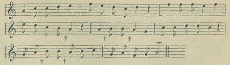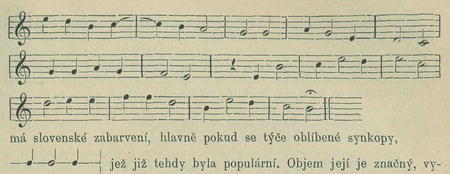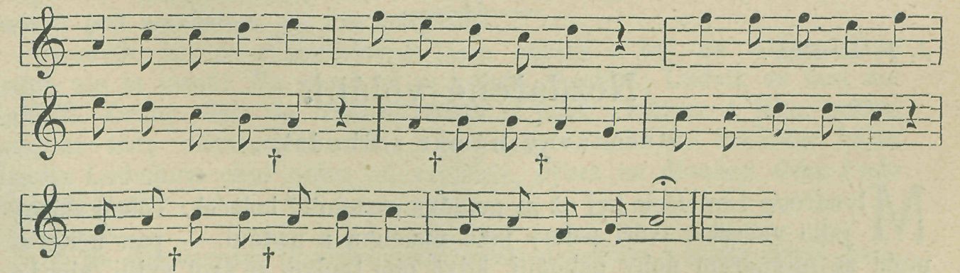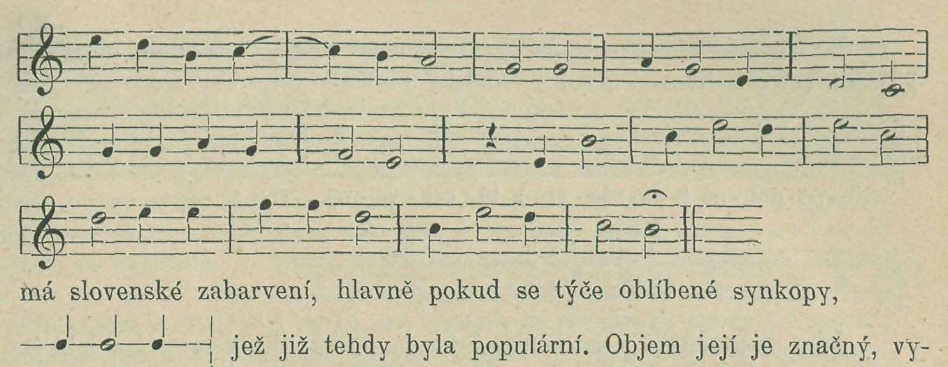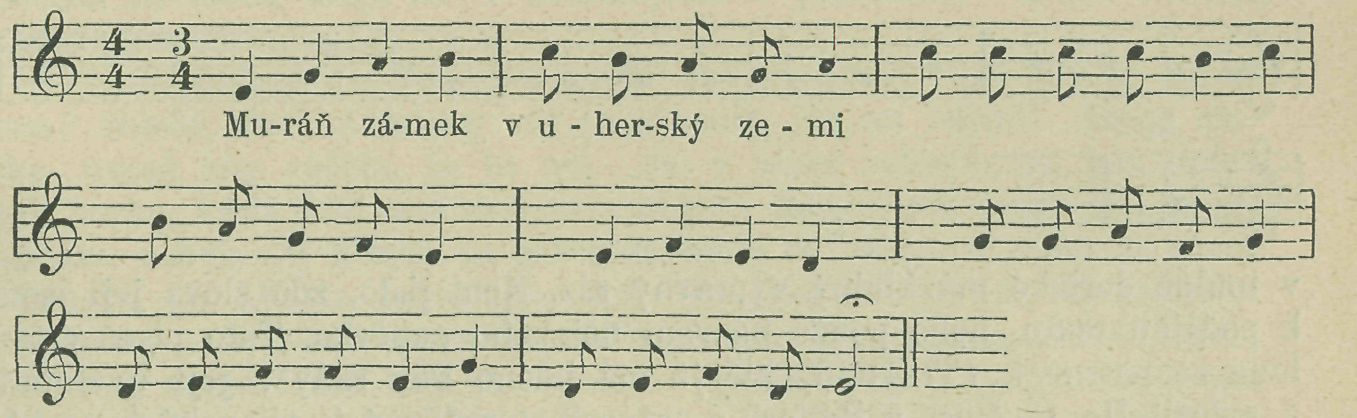 poukazuje na 7/4 takt, střídaní i/i a 8/á, jehož baladický a epický rhytmus se hodí k historickému zpěvu o hradu Muráni. Tónina frygická, melodie velmi výrazná a symmetrická. Zajímavo, že v Melissaeově kancionálu z roku 1596 (viz IV. oddíl této studie) je táž píseň Muránský zámek v. tónině aiolické a v i/i taktu. Odchylná tónina vysvětluje se patrně špatným zapsáním kroků půltónových a celotónových, jak možno pozorovati dle označení křížkem: