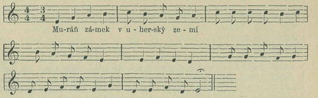 7. Muráň zámek v uherský zemi. U Hostinského (str. 19) byla již uvedena melodie této písně, poněkud však v jiném rhytmisování. Přítomná odnotace
