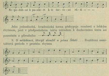 8. Nepodobné k pasdeři, k té červené růži . . . Zřejmě tanečního původu, pravou lidovou písní je aiolský nápěv: