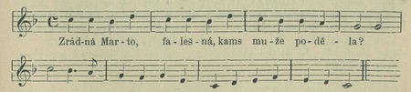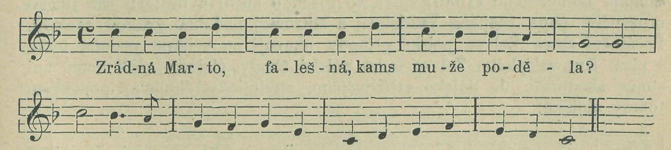 popěvkem. V tónině dorické rázně si vykračuje jednoduchou osmitaktovou periodou. V Nových písních (1580) Šimona Lomnického vyškytá se obdobný zpěv v melodii stejně počínající a končící. Střed její se odchyluje, rovněž počátek textu je poněkud jiný.