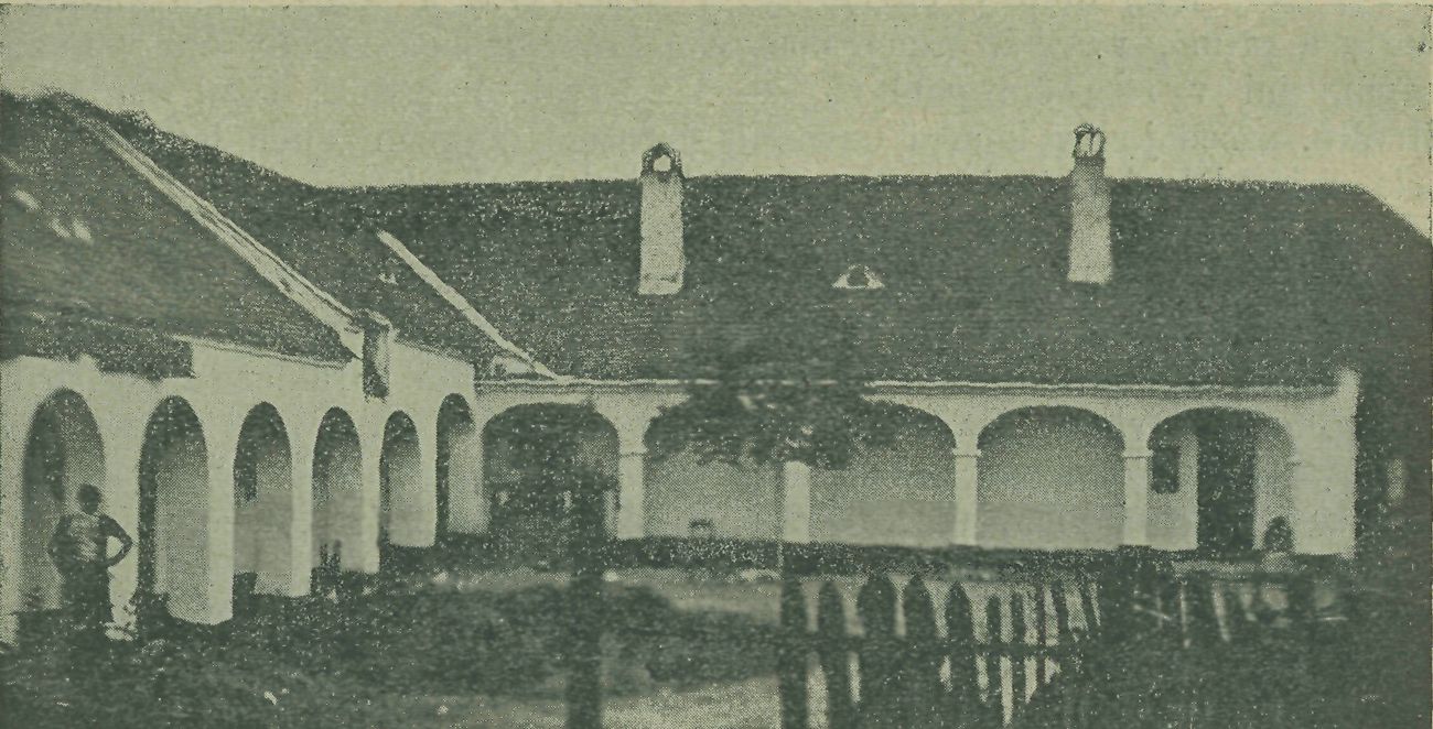 Pogled na dvoř hiže Jaková Siča v Gutfjeldě č. 36. Trjetna. V levo: komory a stáje, V rohu (nugli*) studně. V právo : obydlí s »vijamom« a vedle něho vrata průjezdní. Fotografoval farář Al. Malec.