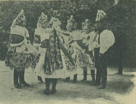Mistříně. Ženské strojí se poněkud jako na Kyjovsku, mají však visuté čtyřhranné obojky na rukávcích, kdežto na Kyjovsku jsou límečky stojaté.
