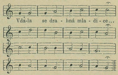 čímž jasně vysvitne jeho vtipná stavba. Prvý úryvek synkopieky stoupá v diatonické stupnici nahoru. Druhý úryvek sestupuje sekveneovitě. Třetí řádek jest symetrickým převratem prvého. Týmže tonem se začne, co se končí, a v převráceném rhytrnu shora dolů se sestupuje na toniku. Poslední úryvek dvakráte opakuje stejný sestupný motivek. Jednoduchá tato melodie nepřináší velké rhytmické změny, čímž se stává jednotvárnou. Jest hříčkou, v níž bohužel slovo zkresleno jest špatnou deklamací. Možná, že její zjevně humoristický způsob vznikl v lidu jako posměšný popěvek »o drahné mladici«.